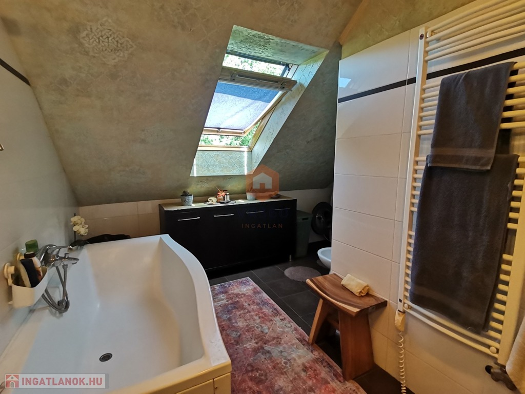 Egyedileg díszített emeleti fürdőszoba, káddal, WC-vel, az alsó szinten külön WC, tároló szoba a lépcső alatt.